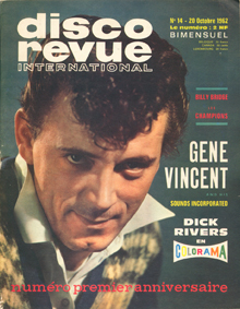 Disco Revue, founded by Jean-Claude Berthon in 1961, remains by far the best ever mag we ever had ; Berthon really knew what Rock'n'Roll was all about and his fabulous covers were the perfect graphic counterparts of the music we love the most. 'Bonjour Les Amis' was really 'Salut Les Copains' number two but their January '64 special Gene Vincent issue is nothing short of phenomenal, with many photos exclusive to that very mag. There's also a graphological study of Gene which, whatever the (perhaps dubious) reasons behind it, proved extremely right ('a character full of complexes who always lies about his own personality'). We also learn there that Gene used to wear a right hand glove on his left hand 'because of a stiffness due to a fractured thumb' following the 1960 car crash. But the fun is spoiled when they give 'May 18, 1936' as Gene's birth date and when they write that Eddie Cochran died in...1958.