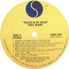 | SASD 7524 | 'Rock's In My Head' Tribute To Buddy Holly/Peggy Sue/Hey Baby/That'll Be The Day/Fool's Gold/I'm In Love Again/Baby I Don't Care/Rave On/For Me & For You/Everybody/It's All Over/I'm Gonna Love You Too/Think It Over/ Don't Be Cruel |