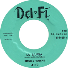 29, 30, 31 & 32- La Bamba From master studio sessions - band track (takes 1, 2, 5, 7 & 8). All mono. This is the song that Ritchie was reluctant to record and which became the one with which he is essentially remembered. At least, he lived long enough to see it provide him with a double-sided hit when coupled with 'Donna'. It is simply a timeless recording. What's more, it was cut live at Gold Star at the same session where 'Donna' was overdubbed. There's no demo tape of the song here, only some of the eight takes it took to hone the band track to perfection. It's mesmerizing to hear how, after a few false starts, one complete take (no. 5) and much discussion in the studio between Bob and the whole gang, things had quickly clicked into place by take 8 which is indeed the master backing track used on the released version (Del-Fi 4110). The usual musicians hired by Keane were present : René Hall (danelectro bass), Buddy Clarke or Red Callender (upright bass), Irving Ashby and perhaps Carole Kaye (rhythm guitar), Earl Palmer (drums) plus Ernie Freeman who is clearly heard playing the inverted piano riff which was mixed out for some reason. Now, there is some confusion about who played lead guitar. I am under the impression that Rob Finnis hadn't read B. Mendheim's book because he states that it's René Hall who plays the guitar solo. However, both René Hall and Bob Morales (Ritchie's half brother) told Mendheim that it was Ritchie who played lead guitar, and it should really have been him. The tapes do reveal that Ritchie did a guide vocal during the recording of the band track, a bit of which can still be heard at approximately 1'30 right after the guitar solo. Bob Keane said they then overdubbed Ear Palmer on wood blocks and Ritchie's definitive vocal, who for once used a hand-held mike. René Hall has said that Ritchie did contribute lots of ideas during sessions, humming what he would like the other players to do. Regarding 'La Bamba', Keane has confirmed that the original bass pattern came from Ritchie. But it's also fair to say that Bob Keane did a remarkable job to conduct the session. More than with any other of his songs, 'La Bamba' is the reason why Ritchie Valens is, in the words of Keane himself, 'immortal'.
